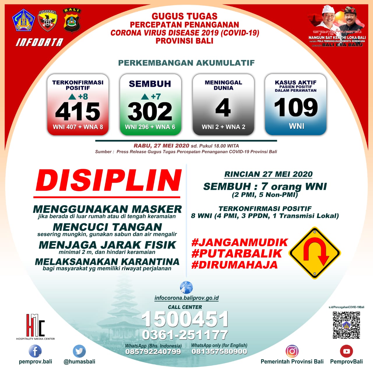 “Kabar baiknya, jumlah pasien yang telah sembuh sebanyak 302 orang. Hari ini bertambah 7 orang WNI terdiri dari 2 orang PMI dan 5 orang transmisi lokal, dan astungkara tidak ada tambahan pasien yang meninggal atau tetap berjumlah 4 orang,” ujarnya, Rabu (27/5/2020).