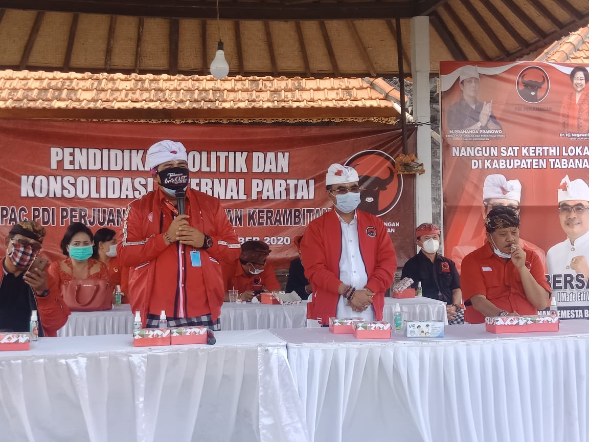 TABANAN, Kilasbali.com – Pengurus dan kader Partai PDIP di Kecamatan Kerambitan siap ‘tancap gas’ untuk memenangkan Paket I Komang Gede Sanjaya dan I Made Edi Wirawan (Jaya-Wira) yang diusung oleh PDIP pada Pilkada Tabanan 2020. Hal tersebut terungkap saat Pendidikan Politik dan Konsolidasi Internal Partai di PAC Kerambitan, Sabtu (19/9/2020).