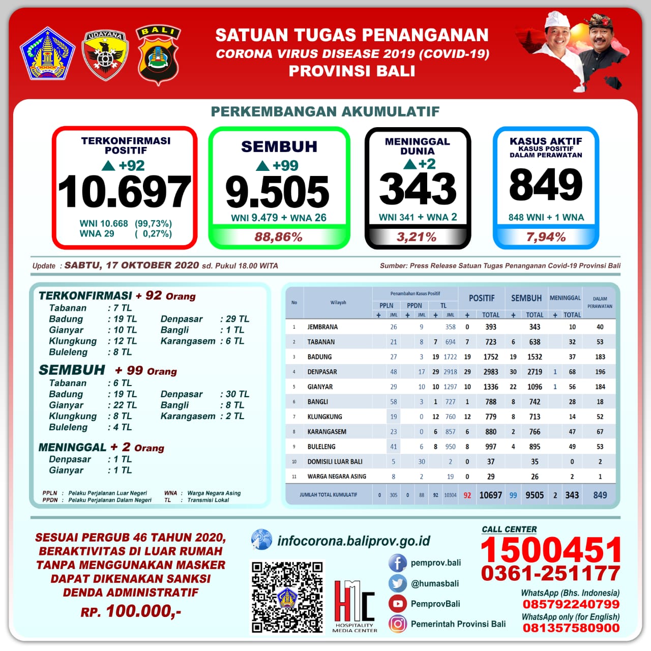 DENPASAR, Kilasbali.com – Kabar baik kembali disampaikan Ketua Harian Satuan Tugas Penanganan Covid-19 Provinsi Bali, Dewa Made Indra. Perkembangan pandemi Covid-19 di Provinsi Bali per hari ini, Sabtu (17/10/2020) mencatat pertambahan sembuh sebanyak 99 orang.