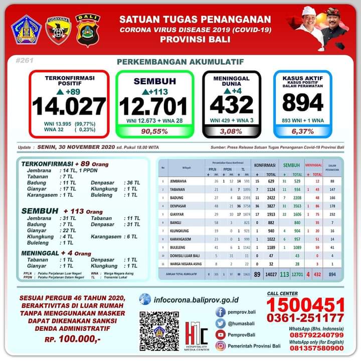 DENPASAR, Kilasbali.com – Perkembangan pandemi Covid-19 di Provinsi Bali per hari ini, Senim (30/11/2020) mencatat pertambahan kasus terkonfirmasi positif sebanyak 89 orang yang terdiri dari 88 orang melalui transmisi lokal dan satu Pelaku Perjalanan Dalam Negeri (PPDN).