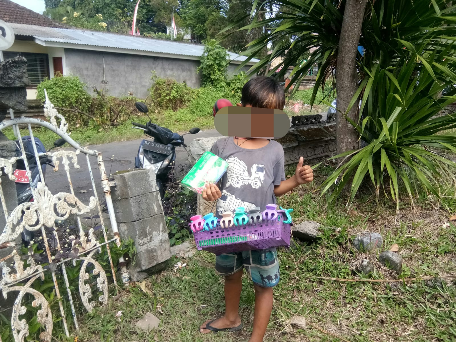 Salah seorang bocah, bernama Gede yang mengaku saat ini duduk di kelas tiga Sekolah Dasar (SD) di Kabupaten Karangasem. Dia keliling bersama dua saudara, Putra dan Gede yang belum duduk di bangku sekolah. Mereka juga mengaku mendapat barang dagangan dari kakaknya. Namun, saat ditanya keberadaan orang tuanya, mereka memilih menghindar.